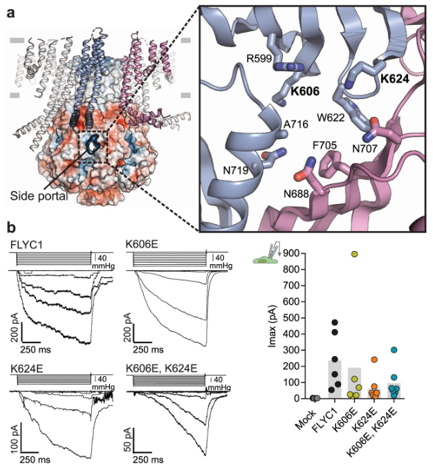 Here, we characterize FLYC1 by cryo-electron microscopy, molecular dynamics simulations, and electrophysiology. Akin to bacterial MscS and plant MSL1 channels, we find that FLYC1 central core includes side portals in the cytoplasmic cage that regulate ion preference and conduction, by identifying critical residues that modulate channel conductance.