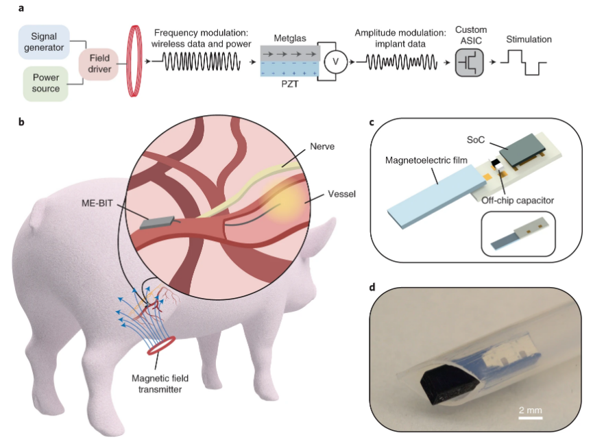 We report the design and in vivo proof-of-concept testing of an endovascular wireless and battery-free millimetric implant for the stimulation of specific peripheral nerves that are difficult to reach via traditional surgeries. Minimally invasive magnetoelectric implants may allow for the stimulation of nerves without the need for open surgery or the implantation of battery-powered pulse generators.