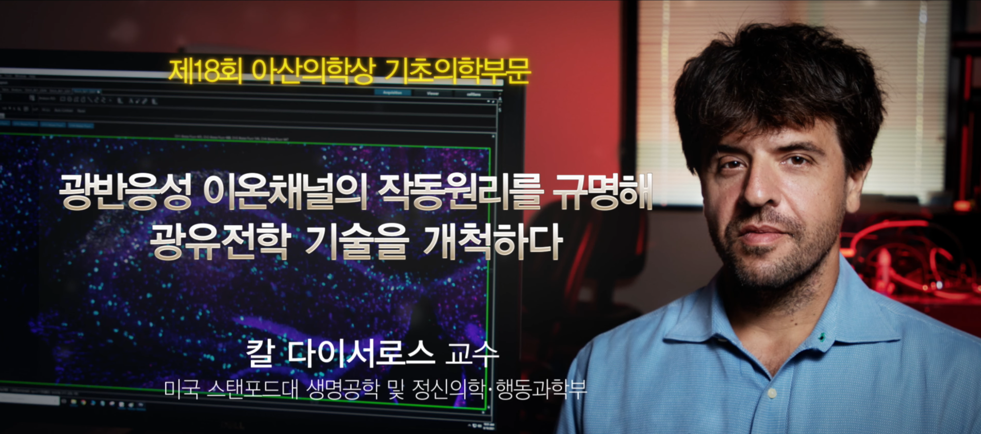 제18회 아산의학상 기초의학부문 수상자인 칼 다이서로스 스탠퍼드대 교수는 ‘광유전학(optogenetics)’이라는 혁신적 생명공학 기술을 창시한 인물이다. 그는 2025년 시상식 참석을 위해 한국을 찾았고, 최근에는 노벨 생리의학상의 유력한 후보로도 거론되고 있다. 광유전학은 특정 유전자를 조작해 세포에 빛에 반응하는 단백질을 발현시키고, 이를 통해 세포의 활동을 정밀하게 조절하는 기술이다. 주로 뇌의 신경세포를 조작하는 데 사용되며, 신경 및 정신질환 치료의 가능성을 열었다는 평가를 받고 있다.